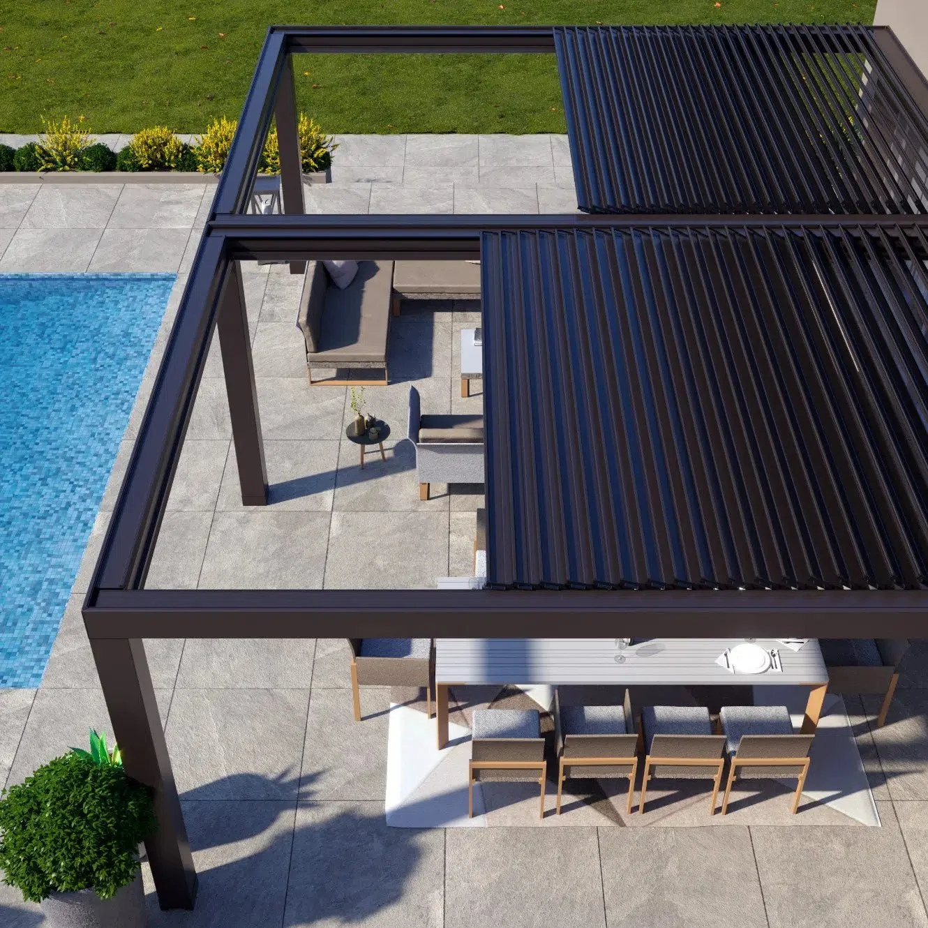 Nos auvents sont dotés d'une armature en aluminium extrudé résistante, renforcée pour plus de solidité et recouverte d'une peinture émaillée cuite au four (disponible en blanc, beige ou noir). Cela leur garantit une résistance à la rouille et à l'écaillage au fil du temps.
